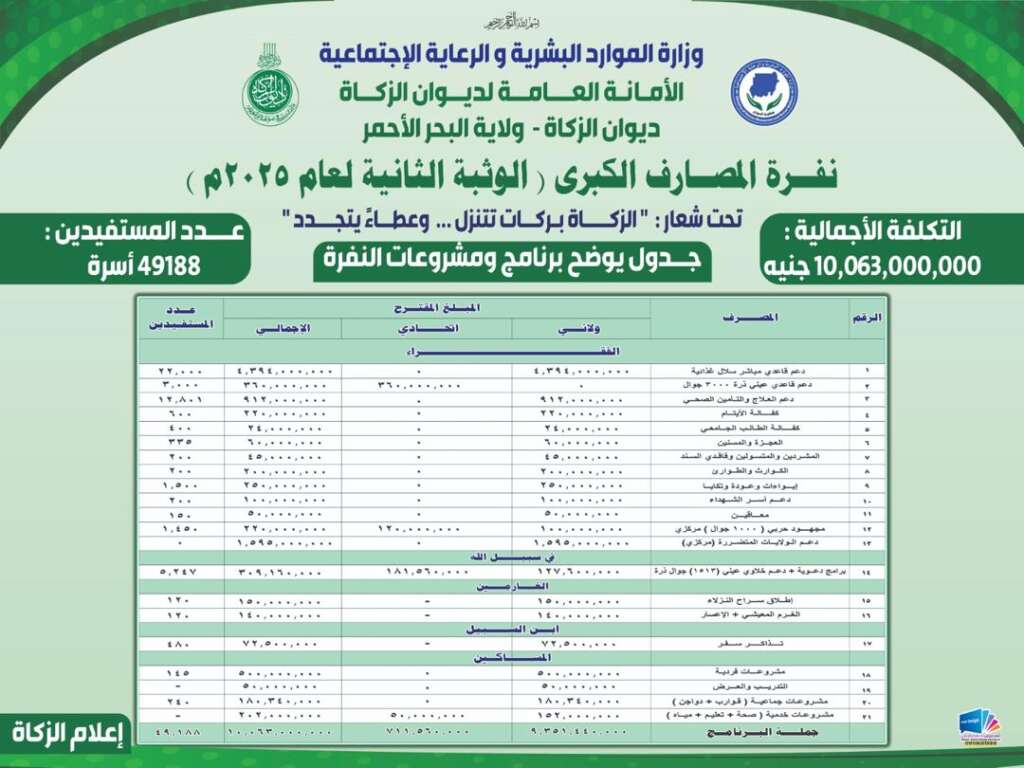 أعلنت أمانة ديوان زكاة ولاية البحر الأحمر عن انطلاق نفرة المصارف الكبرى (الوثبة الثانية 2025م يوم الأربعاء 4 ديسمبر تشمل جميع محاور ومشروعات متعددة بمبلغ 10.000000000جنيه لعدد 49188اسرة