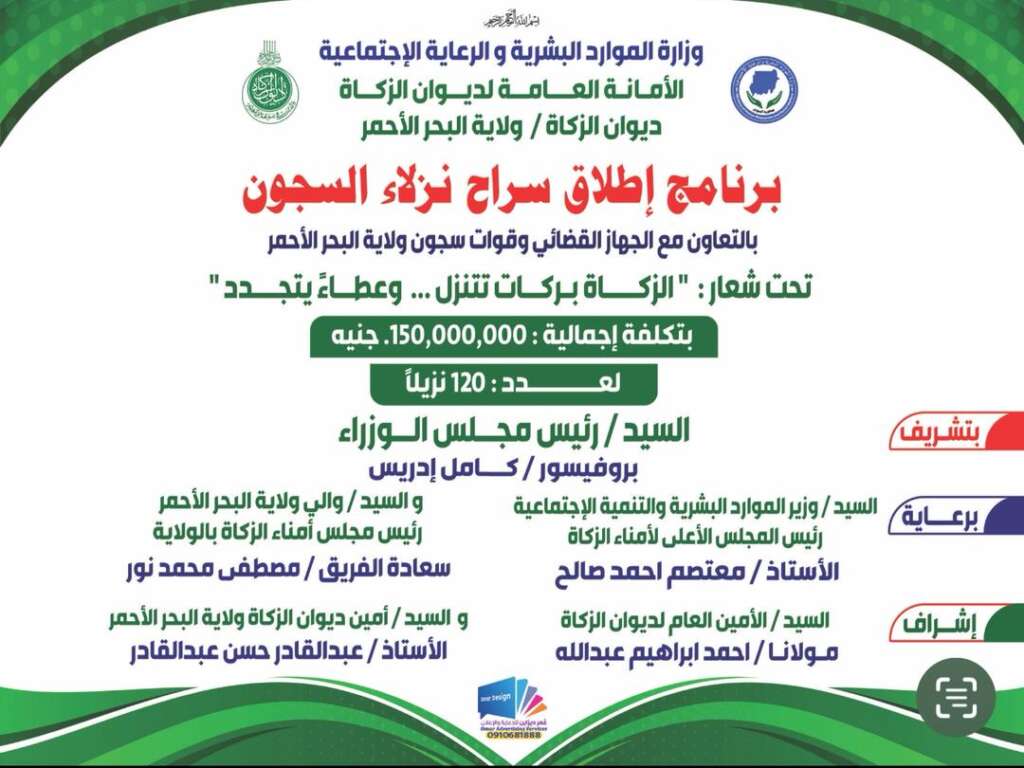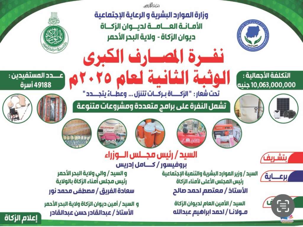 ديوان الزكاة بالبحر الأحمر تعلن عن انطلاق نفرة المصارف الكبرى لمشروعات متعددة بمبلغ 10الف (مليار بالقديم)