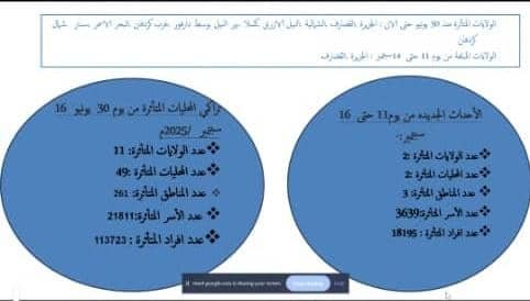 وكشفت اللجنة، تأثر ولايتي الجزيرة والقضارف، بالسيول والامطار في الفترة 11-16سبتمبر الجاري، منها محليتين، و3 مناطق، فيما تضررت 3639 اسرة، و18195 فردا، فيما تراكمياً من 30 يونيو وحتى 16 سبتمبر الجاري 11 ولاية، بينها 49 محلية، 261 منطقة، وتضررت 21811 اسرة، و113723فردا.
