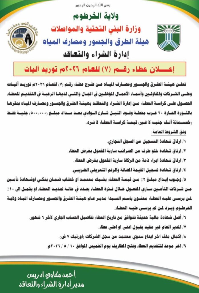 تعلن هيئة الطرق والجسور ومصارف المياه عن طرح عطاء رقم (7) للعام 2026م توريد آليات وعلى الشركات والمقاولين وأسماء الأعمال المؤهلين في المجال والتي لديها الرغبة في التقديم للعطاء الحصول على كراسة العطاء من إدارة الشراء والتعاقد بهيئة الطرق والجسور ومصارف المياه بمقرها بالثورة الحارة 20 غرب محطة وقود النيل شارع الوادي بعد سداد مبلغ (500,000) جنية فقط (خمسمائة ألف جنيه لا غير) قيمة كراسة العطاء لا ترد