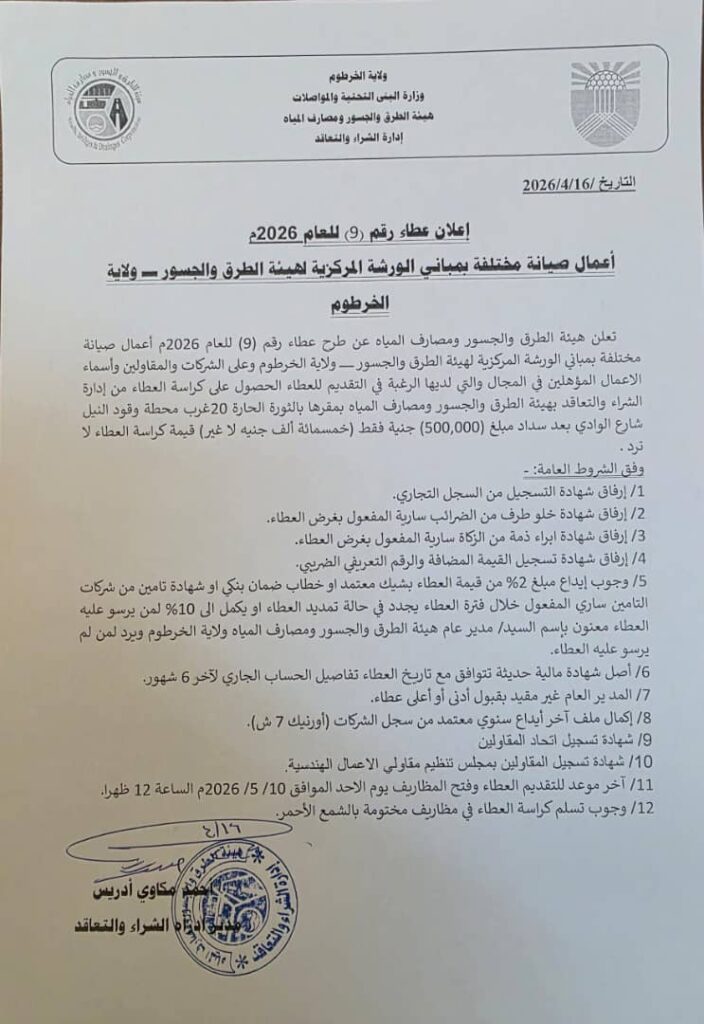 أعلنت هيئة الطرق والجسور ومصارف المياه عن طرح عطاء رقم (9) للعام 2026م أعمال صيانة مختلفة بمباني الورشة المركزية لهيئة الطرق والجسور – ولاية الخرطوم وعلى الشركات والمقاولين وأسماء الاعمال المؤهلين في المجال والتي لديها الرغبة في التقديم للعطاء الحصول على كراسة العطاء من إدارة الشراء والتعاقد بهيئة الطرق والجسور ومصارف المياه بمقرها بالثورة الحارة 20 غرب محطة وقود النيل شارع الوادي بعد سداد مبلغ (500,000) جنية فقط (خمسمائة ألف جنيه لا غير قيمة كراسة العطاء لا ترد