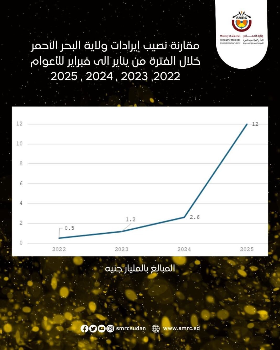 حققت الشركة السودانية للموارد المعدنية قفزة غير مسبوقة في إجمالي إيرادات التعدين بولاية البحر الأحمر ومحلياتها خلال الفترة من يناير إلى فبراير 2025م حيث بلغ 12 مليار جنيه مقارنة بـ 2.6 مليار جنيه في 2024م و 1.2 مليار جنيه في 2023 و0.5 مليار جنيه في 2022م مما يعكس نمواً ضخماً في القطاع.