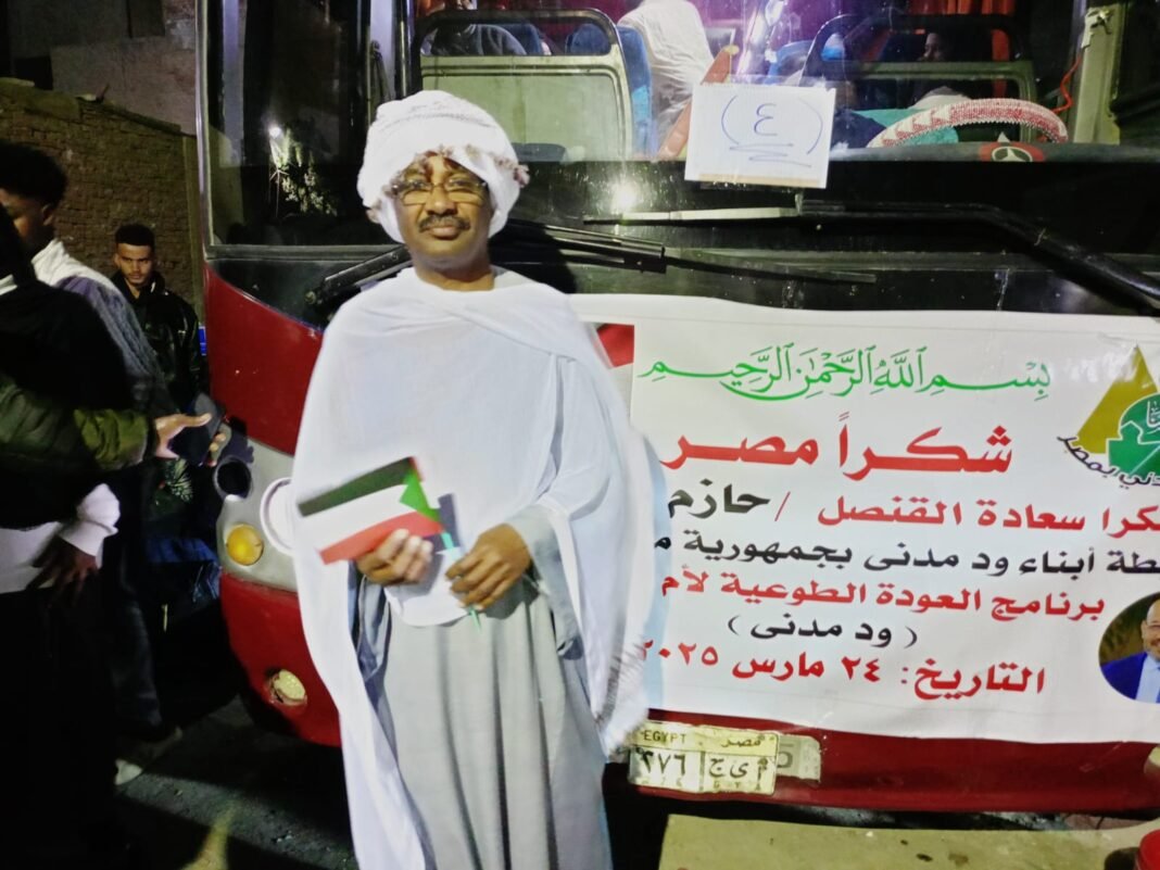 وقال رئيس رابطة أبناء مدني بالقاهرة الأستاذ الفاتح خضر الكاشف إن القنصل حازم مصطفى تكفل بقيمة بصات الفوج الثاني.