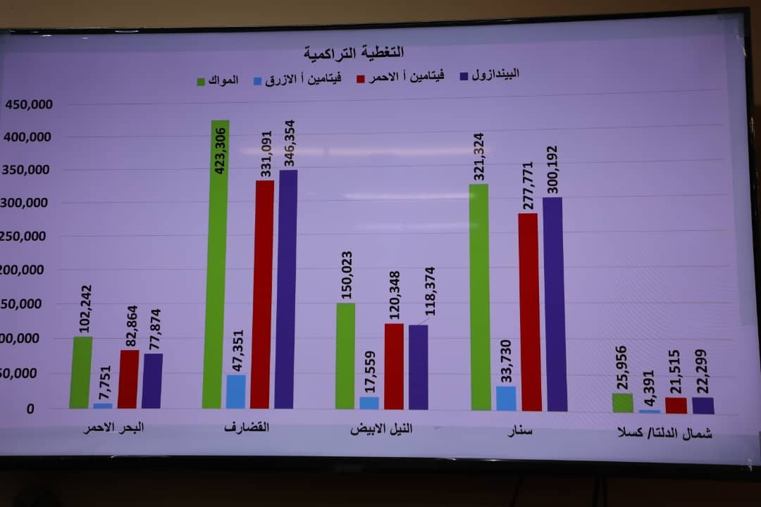 وقالت منسق التغذية في الطوارئ بالبرنامج القومي للتغذية رانيا أحمد داؤود في تصريح صحفي عقب الختام اليوم بقاعة مركز عمليات الطوارئ بكسلا، إن الولايات شملت القضارف، البحر الأحمر، والنيل الأبيض، سنار وكسلا، والتي تهدف إلى اكتشاف الأطفال أقل من عمر خمس سنوات والمصابين بسوء التغذية، توزيع حبوب فيتامين أ للأطفال والبيندازول، فضلا عن توزيع حبوب الفيفول للنساء الحوامل والمرضعات، بجانب الإرشادات الصحية والتغذوية للمجتمع.