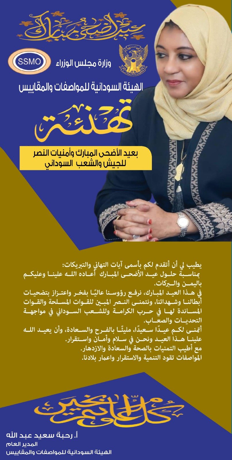 هنأ المدير العام للهيئة السودانية للمواصفات والمقاييس الدكتورة رحبة سعيد عبد الله الشعب السوداني بعيد الاضحي المبارك.