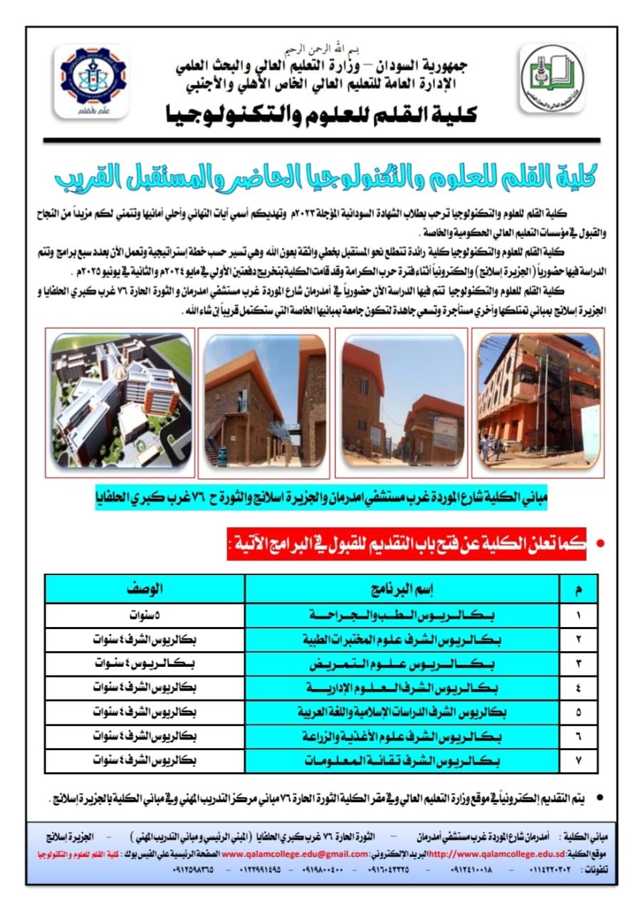 هنأت كلية القلم للعلوم والتكنلوجيا طلاب الشهاده السودانية الدفعة المؤجلة للعام 2023 بالنجاح والتفوق معربة عن تمنياتها لهم بالقبول فى مؤسسات التعليم العالى الحكومية والخاصة واعلن عميد الكلية بروفيسور جودة الله عثمان فى تصريح صحفى عن فتح الكلية لباب التقديم والقبول للكلية موضحا ان كلية القلم كلية رائدة تتطلع نحو المستقبل وتسير بخطى واثقة وفق خطة استراتيجية مضيفا ان الكلية تعمل حاليا بعدد) 7) برامج الدراسة فيها حضوريا بمنطقة (الجزيرة اسلانج) فيما كانت الدراسة الكترونيا اثناء شهور حرب الكرامة منوها الى تخريج الكلية لدفعتين الاولى فى مايو 2024 والثانية فى يونيو 2025 موضحا ان الدراسة فى الكلية( حضوريا) فى ام درمان شارع الموردة غرب مستشفى ام درمان وفى الثورة الحاره (76) غرب كبرى الحلفايا والجزيرة اسلانج فى مبانى خاصة بالكلية مشيرا الى سعى مجلس الامناء وادارة الكلية مع الجهات ذات الصلة بوزارة التعليم العالى لترفيع الكلية الى جامعة بمبانيها الخاصة التى ستكتمل قريبا