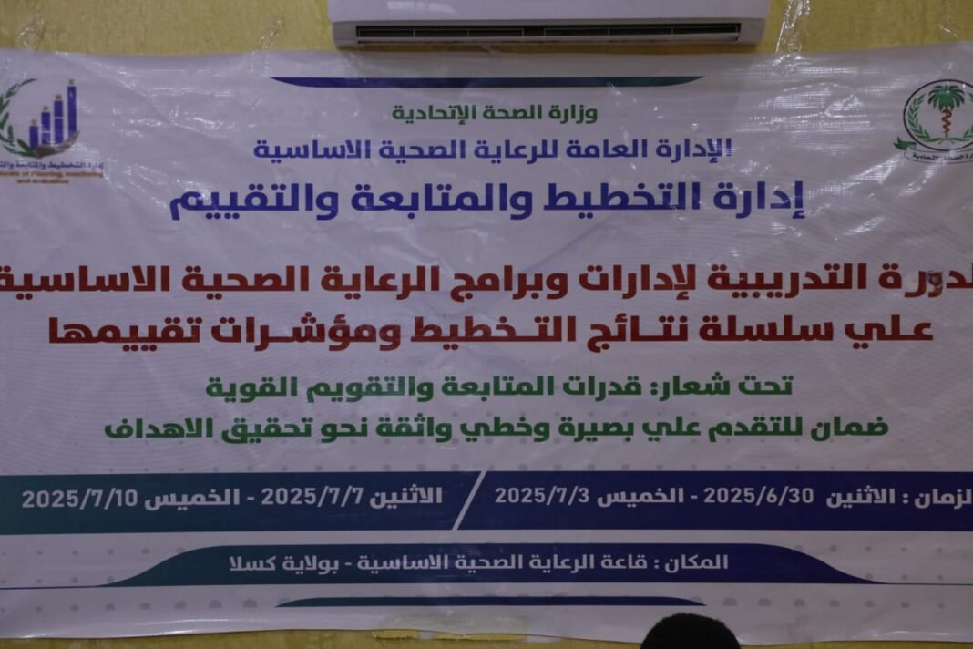 انطلقت صباح اليوم بقاعة الإدارة العامة للرعاية الصحية الأساسية الاتحادية بمدينة كسلا، الدورة التدريبية لإدارات وبرامج الإدارة العامة للرعاية الصحية الأساسية، على سلسلة نتائج التخطيط ومؤشرات تقييمها، والتي تنظمها إدارة التخطيط والمتابعة والتقييم، وتستمر حتى الخميس القادم، وجاءت تحت شعار قدرات المتابعة والتقويم القوية ضمان للتقدم على بصيرة وخطى واثقة نحو تحقيق الأهداف.