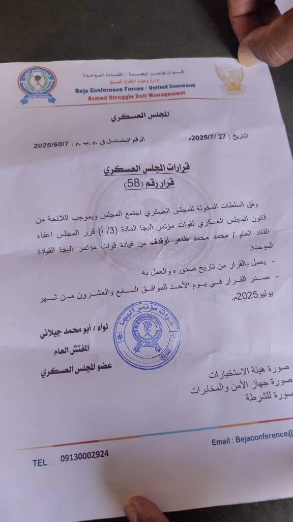اعفى المجلس العسكري بقوات مؤتمر البجا القيادة الموحدة القائد العام محمد محمد طاهر اوقدف من قيادة القوات .