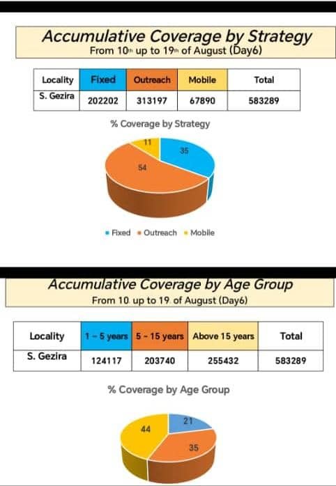 وأكدت الغرفة، تغطية (583،289)شخصاً بلقاح الكوليرا بمحلية جنوب الجزيرة في يومها السادس أمس، من المستهدف الكلي (779،294) شخصاً، فيما كانت التغطية بولاية الخرطوم (628،248) شخصاً، من الإجمالي البالغ (1،106،229) شخصاً،في حين بمحلية السوكي تمت تغطية (103،713)في يومين، من المستهدف (421،439)شخصاً.