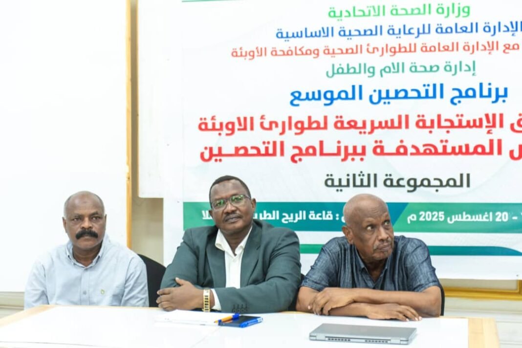 اختتمت وزارة الصحة الاتحادية ممثلة في الادارتين العامتين (الرعايةالصحيةالأساسية والطوارئ الصحيةومكافحةالاوبئة)اليوم بقاعة الريح الطريفي بمدينة كسلا، (ورشة تدريب فرق الاستجابةالسريعة لطوارئ الاوبئة والامراض المستهدفة ببرنامج التحصين).